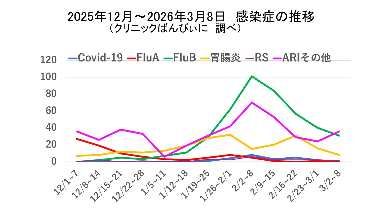 インフルエンザB型は減少傾向ですが、思ったよりしつこいですね。3月中旬には収束するだろうとお伝えしましたが、完全に収束するのは3月下旬になるかもしれませんので、卒業式に影響がでるかもしれません。