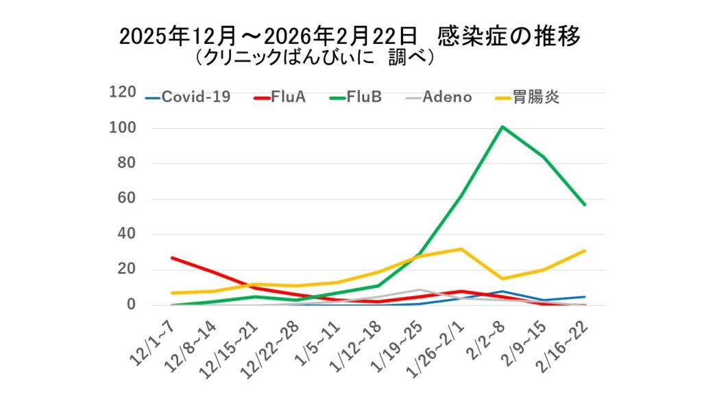 メディアでは、インフルエンザB型が猛威、5週連続感染者数増加と報じています。近隣のクリニックでも先週はインフルエンザはまだ増えていますとの情報もありますが、おそらく先週ぐらいがこの地域でのインフルエンザB型のピークとなるでしょう。 胃腸炎...